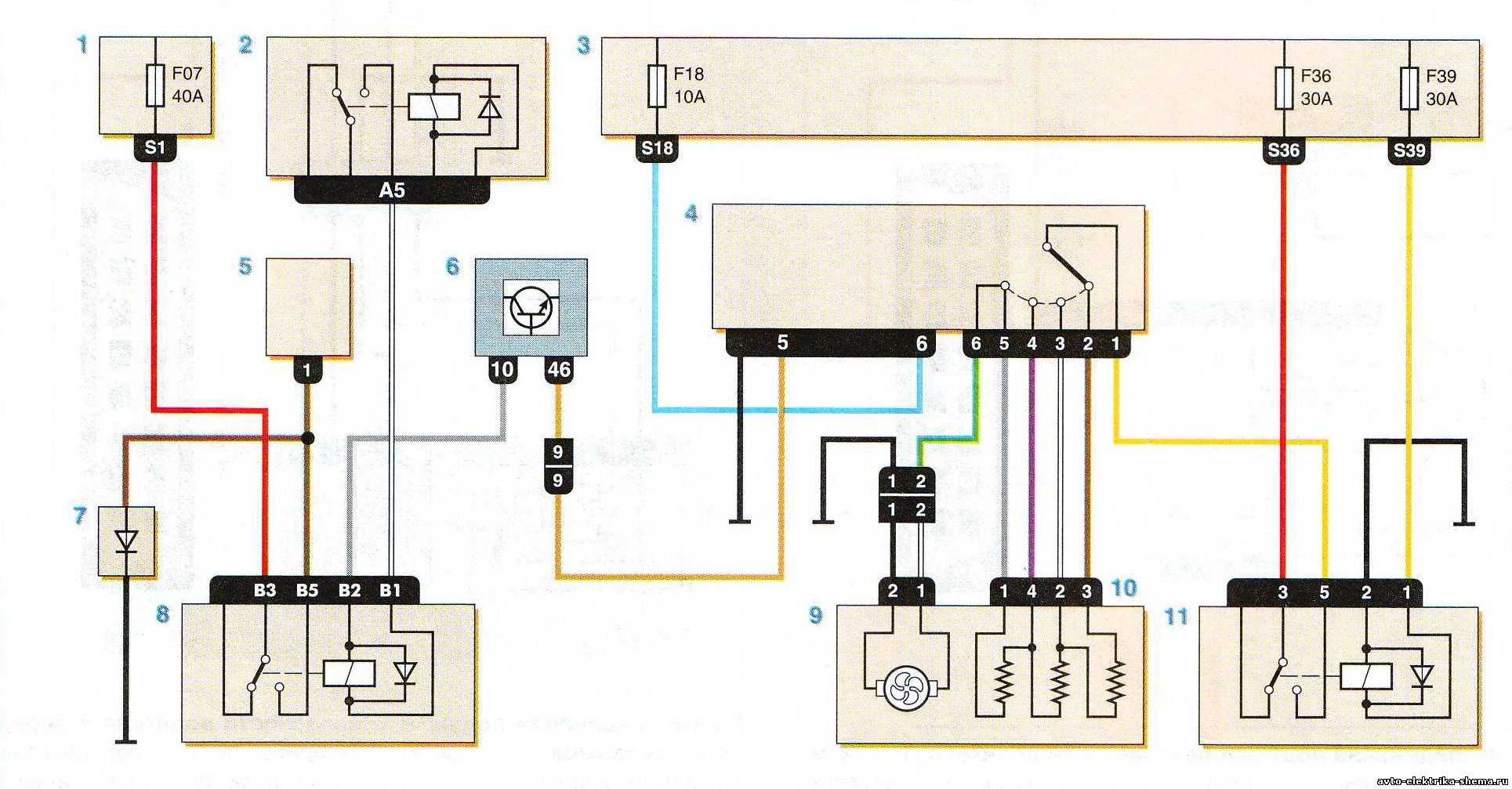Схема соединений системы вентиляции, отопления и кондиционирования: 1 — монтажный блок реле и предохранителей в моторном отсеке; 2 — главное реле 3 — монтажный блок предохранителей в салоне; 4 — блок управления вентиляцией, отоплением и кондиционированием; 5 — муфта компрессора кондиционера; 6 — ЭБУ; 7 — диод кондиционера; 8 — реле включения кондиционера; 9 — электровентилятор отопителя; 10 — дополнительный резистор электровентилятора отопителя; 11 — реле электровентилятора отопителя