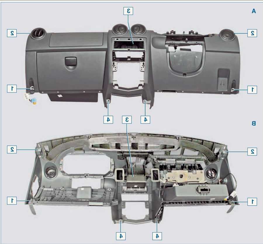 (А — наружная сторона панели приборов; B — внутренняя сторона панели приборов)