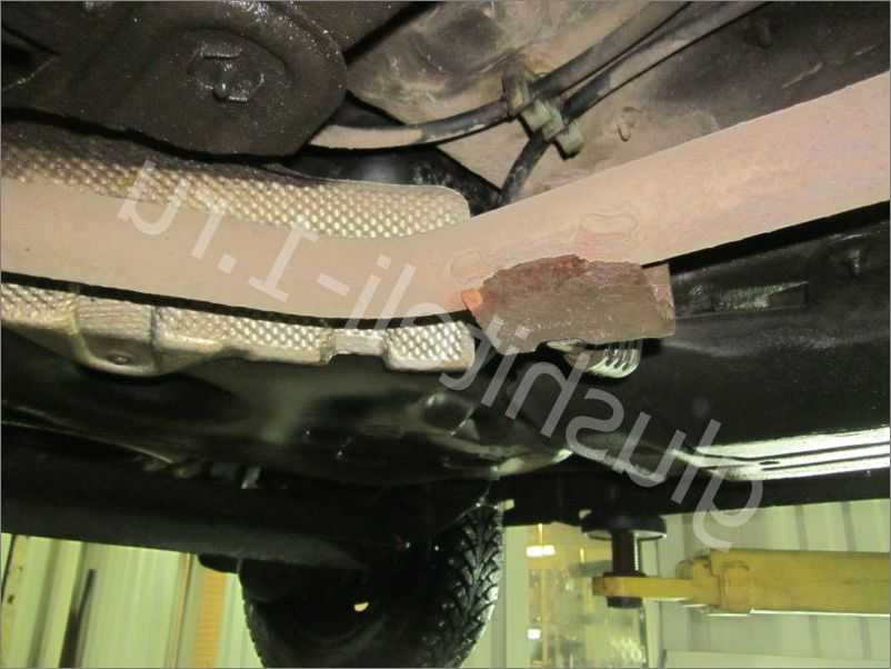 Далее снимаем глушитель с резинок в центре кузова, точно также как снимали в задней части. В результате этого можно увидеть, что он лег на заднюю балку.