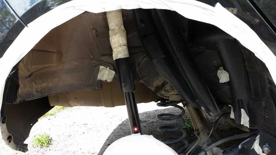 Далее снимаем задние полуподкрылоки, брызговики. Все болтики, винтики, стойки и т.д. в общем все, что может откручиваться, оклеиваем малярным скотчем. Во избежании дальнейших проблем в случае снятия, ибо мастика застынет и пиши пропало…