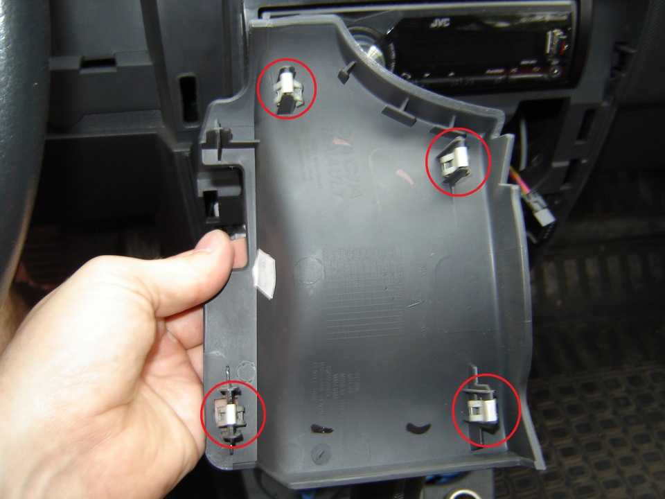 Аккуратно со всех возможных сторон поддеваем левый и правый щитки панели и отщелкиваем защелки.Я это делаю просто руками. На фото показаны защелки на этих щитках.