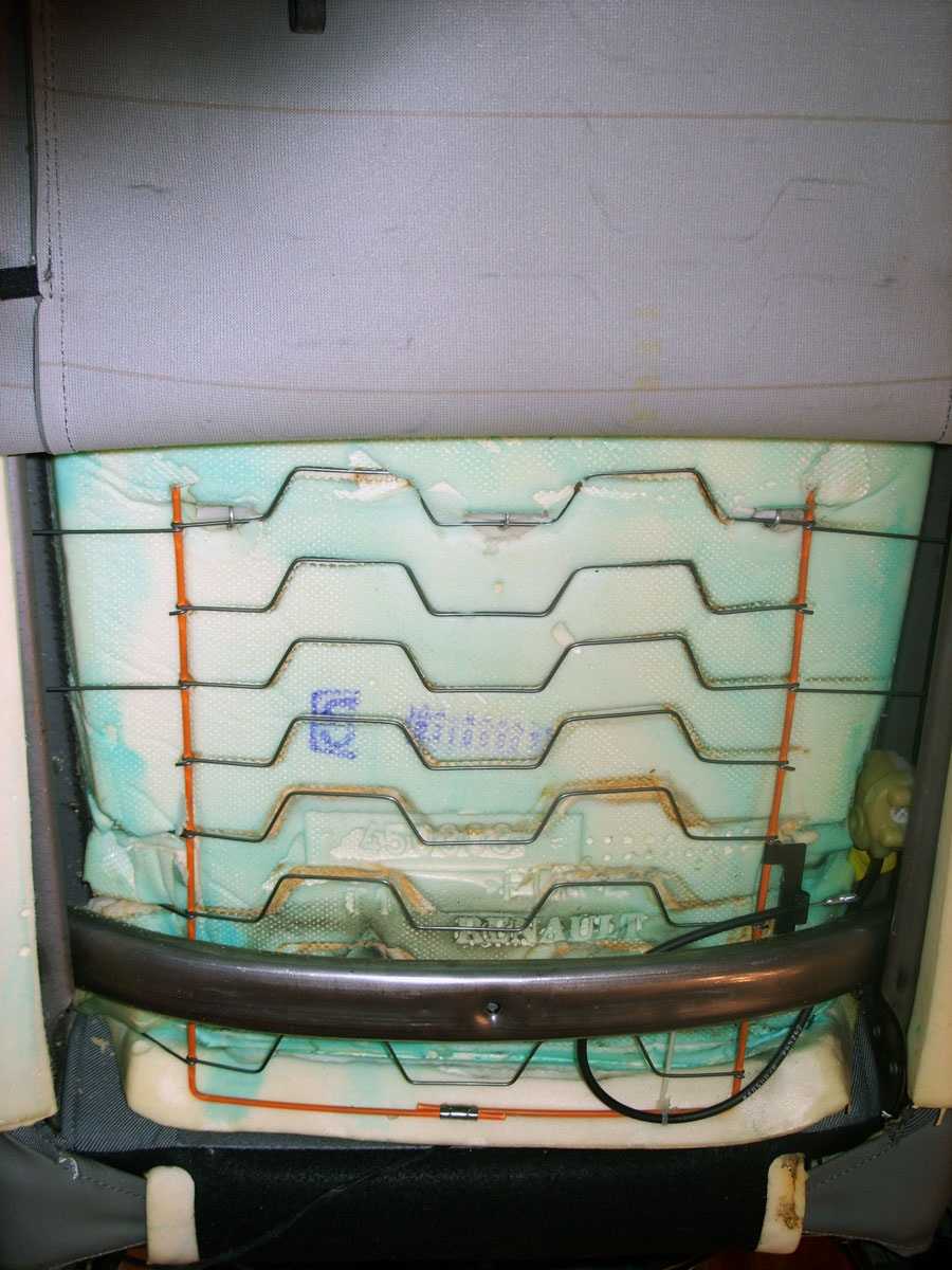 После вскрытия обнаружилась неисправность механизма регулировки поясничного упора — сломано крепление троса. Я всегда ездил с максимально выдвинутым упором, поэтому чинить трос не стал, а просто зафиксировал эту идиотскую конструкцию в максимально натянутом положении проволокой. Конструкция на самом деле идиотская, т.к. натягивает только правую сторону проволочного каркаса, что приводит к большему выпиранию «упора» с правой стороны. По идее, нужно укорачивать две проволочины с левой стороны для равномерного натяжения всей конструкции, но я этого не делал.