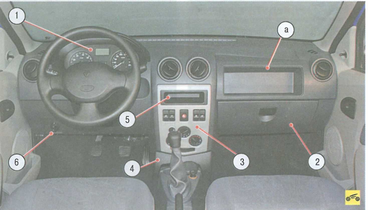 Рис. 11.1. Панель приборов: а — зона установки подушки безопасности переднего пассажира; 1 — комбинация приборов; 2 — вещевой ящик; 3 — центральная накладка панели приборов; 4 — нижняя накладка панели приборов; 5 — заглушка гнезда для магнитолы; 6 — рукоятка корректора света фар