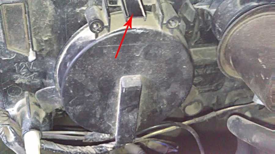 Перед нами два лючка. В одном (я пометил его стрелкой), располагается лампочка ближнего света. Во втором – дальнего и габаритных огней. Как и в первом поколении, просовываем руку в щель и нащупываем нужную крышку. Тут она резиновая. Хватаем ее за специальный лепесток и просто сдергиваем. Под крышкой видим колодку питания, надетую на лампу. Снимаем и ее. Лампочка в Рено Логан второго поколения крепится не при помощи скобы, а тремя защелками (я обозначил их стрелками). Отжимаем защелки отверткой и извлекаем световой прибор.