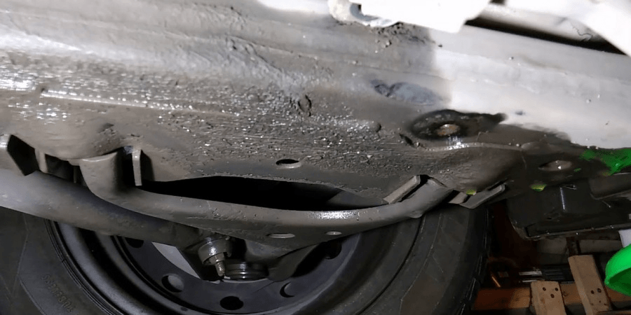 - Визуально оцените состояние подрамника, тяги стабилизатора и рычага на предмет механических повреждений.