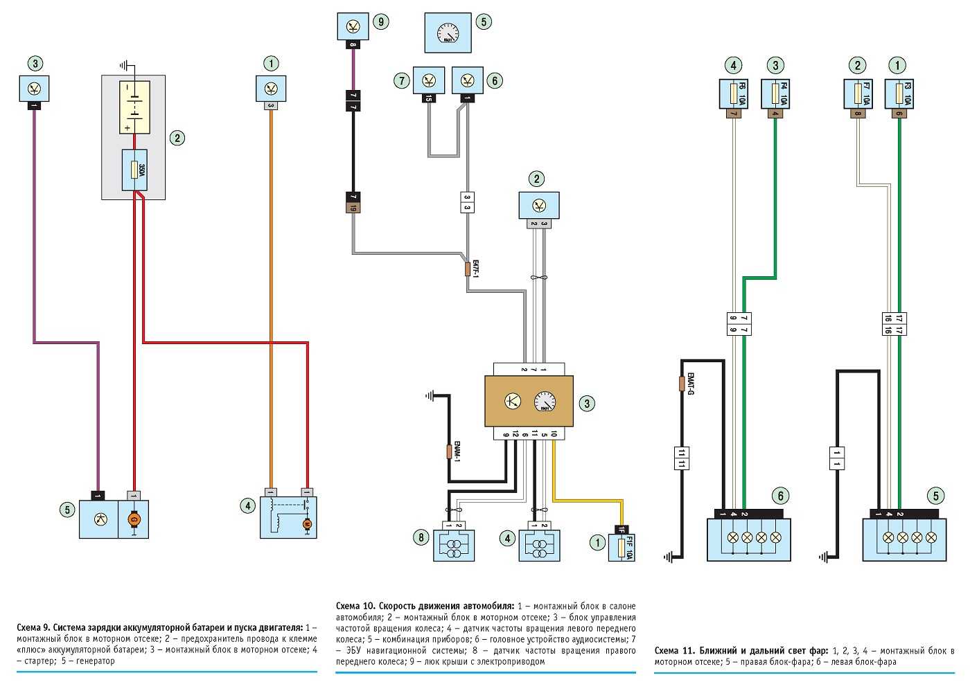 Схема 10. Скорость движения автомобиля: 1 — монтажный блок в салоне автомобиля; 2 — монтажный блок в моторном отсеке; 3 — блок управления частотой вращения колеса; 4 — датчик частоты вращения левого переднего колеса; 5 — комбинация приборов; 6 — головное устройство аудиосистемы; 7 — ЭБУ навигационной системы; 8 — датчик частоты вращения правого переднего колеса; 9 — люк крыши с электроприводом
