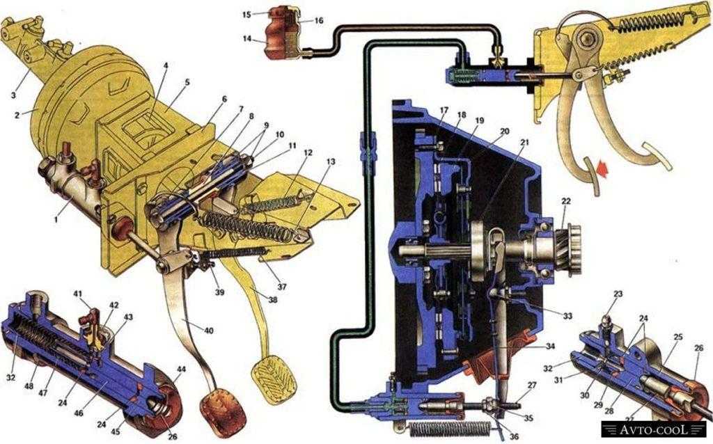 — повышенный люфт в соединении вилок толкателя вакуумного усилителя и педали,
