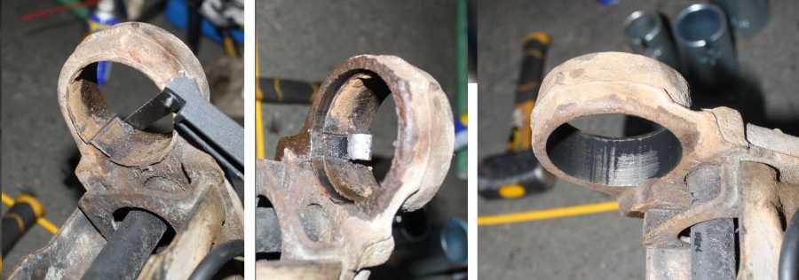 А вот теперь начались танцы с бубнами…Нужно достать внутреннюю обойму из рычагаСкажу сразу времени на два рычага ушло много, не менше 4 часов точно(((Крутил вертел я рычаг и решил обрезать болгаркой внутреннюю обойму почти ровно рычага 0,5-1 см оставил. Далее пробовал ножовкой выпилить кусок обоймы (по аналогии с фото из нета про внешнюю обойму). Херас два((( до конца пропилить не удалось — шлицы ножовкой начал пилить. Но мы не расстраиваемся, берём в руки русский ключ (зубило имолоток, если кто не вкурсе) и вперёд. Наискось всавляем зубило в пропил и добиваем то, что не дорезали, затем выбиваем маленький сегмент обоймы. Следом остаток, который почти сам вывалился.Со вторым рычагом я решил не заморачиваться и сразу сделал две просечки зубиломРезультат: выбил (или высек) я эти обоймы, пару раз откалывалось зубило + пару синяков на руке… НО Я ЭТО СДЕЛАЛ