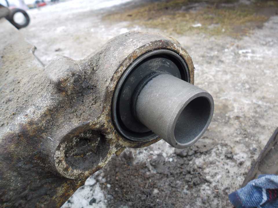 Теперь у нас все помечено, и мы приступаем непосредственно к разбору балкиТ.к. сайлентам у меня было совсем хана то я просто начал бить молотком с внутренней стороны по рычага и он вылез с торсионом и внутренней обоймой сайлента. Отлаживаем пока в сторонуРезину из балки выжигать не пришлось — монтажкой подковырныл и резина вывалилась. С другой стороны правда чуток помучался но вырвалась без вопросовПриступаем к выпресовне внешней обоймы. Можно так: