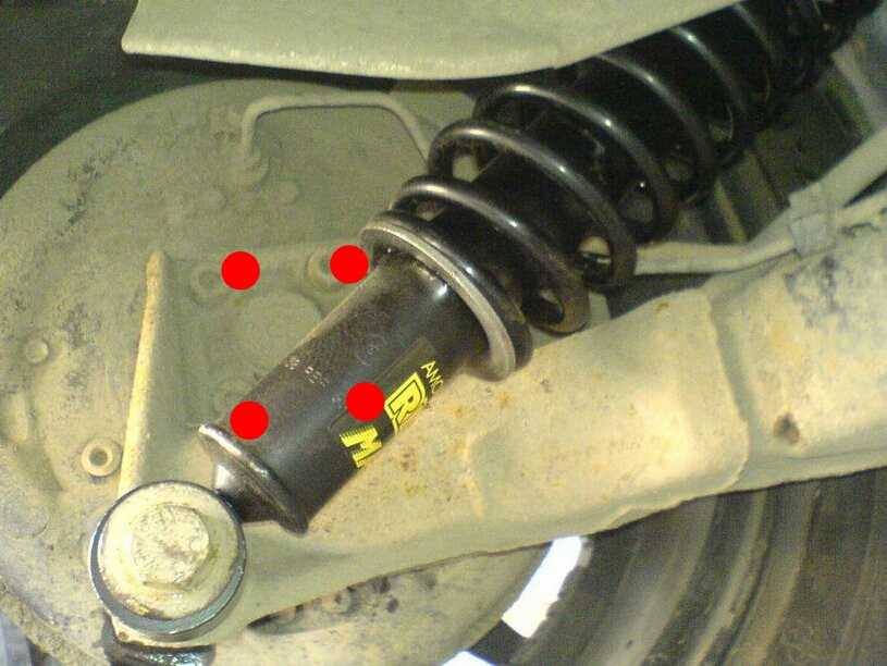 Ослабляем и отсоединяем нижние точки крепления амортизаторов. Верхние можно пока не трогать — в полностью висящем положении меша 2. Пробуем ослабить четыре гайки крепящие балку к кузову.