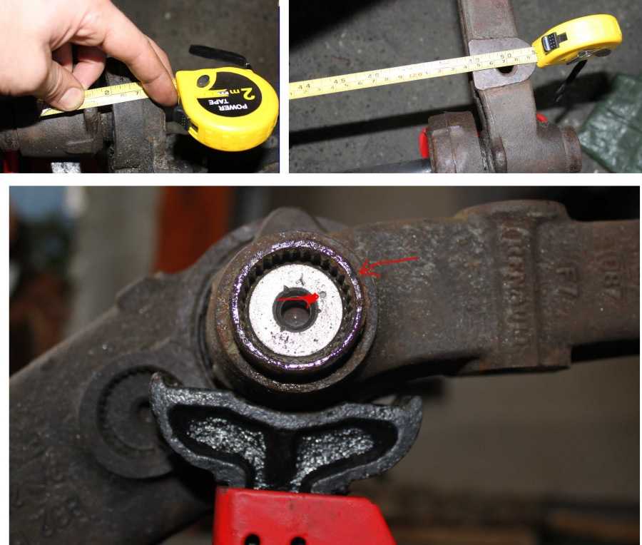 Заданные осевые расстояния замерял простой планкой с подвижным элементом («по русски» = обычная деревянная планка с перпендикулярно ввинченным саморезом настроенным на длину в 37мм.) Навесу прикладывал планку к центру оси рычага и совмещал кончик самореза с центром оси цапфы ===== в нужном положении впрессовывал рычаг на внутреннюю втулку сайленблока, всё темже винтовым способом.