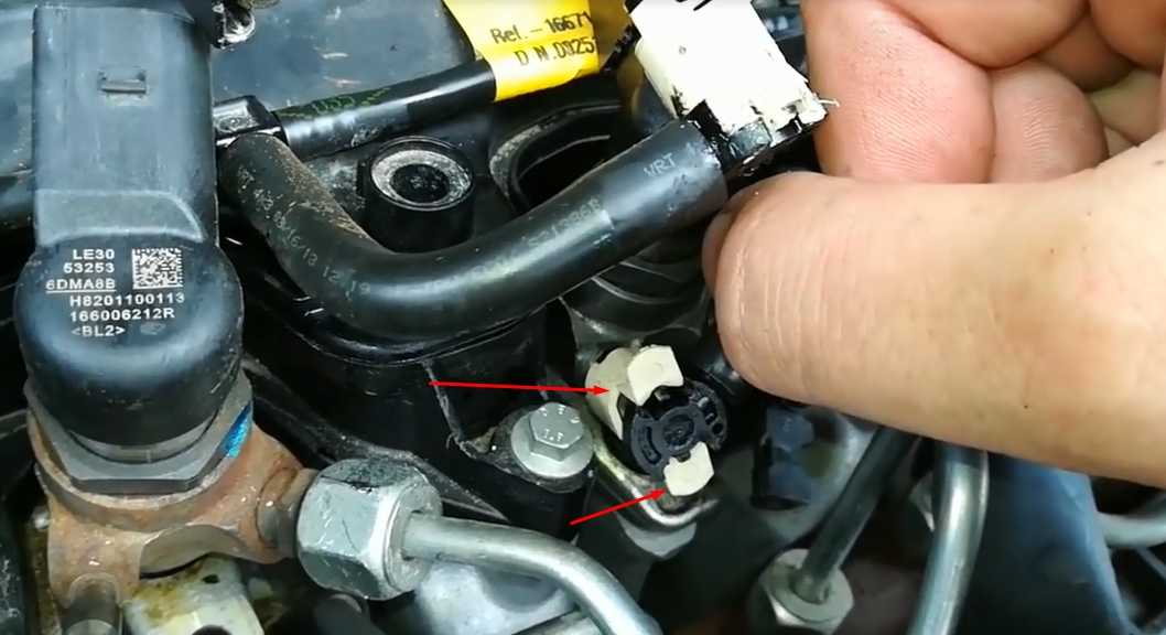 3. Поднимаем белые фиксаторы в сторону и сдергиваем «обратку» с форсунки потянув на себя.