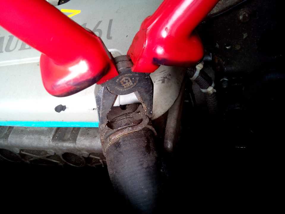 , для этого открутил крышку расширительного бачка и не много отпустил три болта для развоздушивания системы (на радиаторе, на шланге печки возле бочка и на корпусе термостата), снял нижний патрубок радиатора (без плоскогубцев тут ни как).