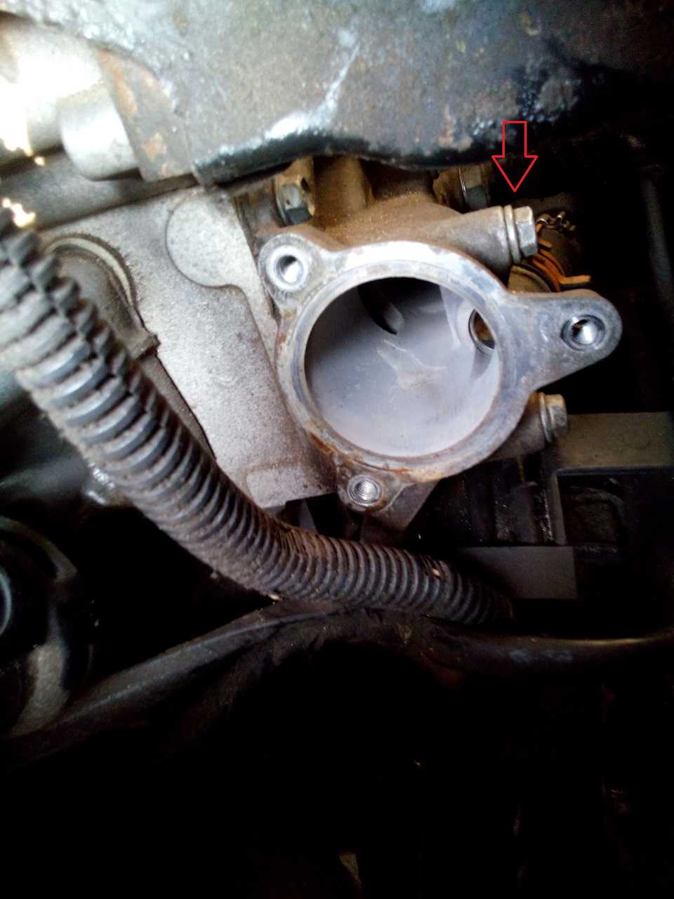 - Для промывки двигателя необходимо демонтировать термостат, но перед этим отключите клеммы аккумуляторной батареи. Непосредственно термостат установлен в кожухе, с левой стороны головки блока цилиндров.