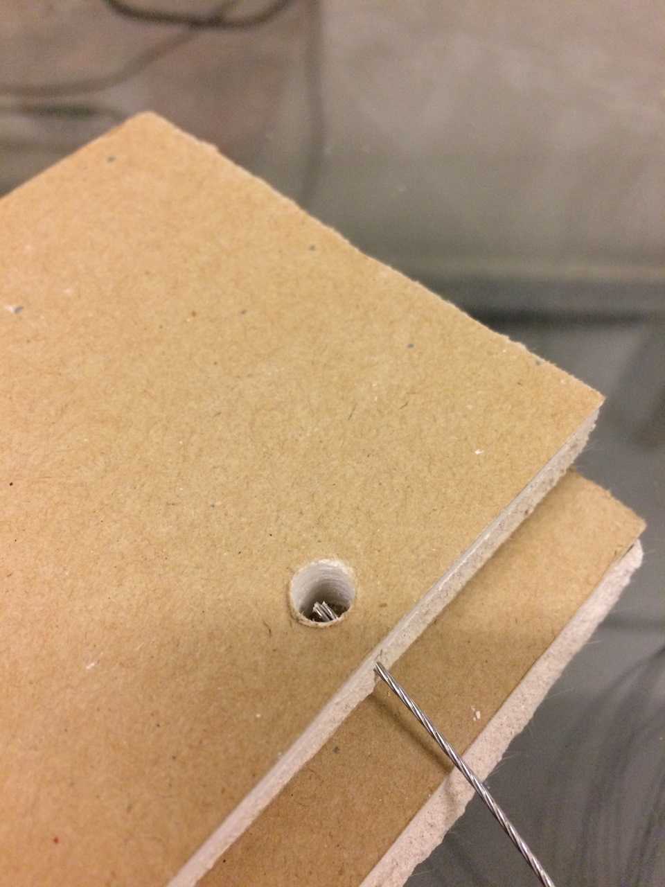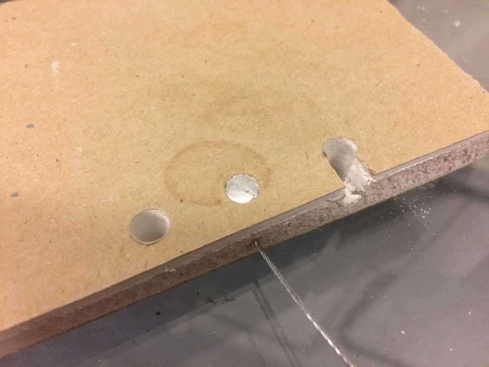 Делаем отверстие под свинцовую бобинку в одном куске гипрока насквозь, а второй кусок прикручиваем с одной из сторон чтоб отверстие закрыть, я делал это сверлом 8мм поскольку исходник был именно такого диаметра, и перпендикулярно проделываем отверстие для самого троса.