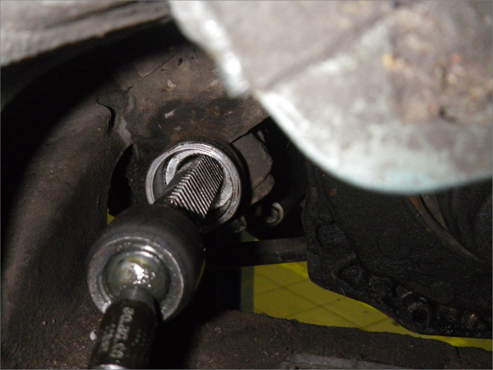 После, ключом на 21 мм отворачиваем на 0,5 оборота контрящую гайку, и снимаем отвинчиваем рулевой наконечник. На рулевой тяге автомобиля Renault Symbol отсутствуют специальные проточки под рожковый ключ для откручивания рулевой тяги.