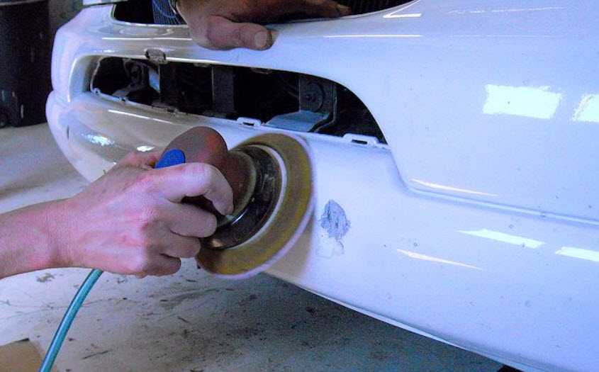 - Сначала обрабатываем всю поверхность бампера с помощью грубой наждачной бумаги, используя наждачный круг и шлифовальную машинку.