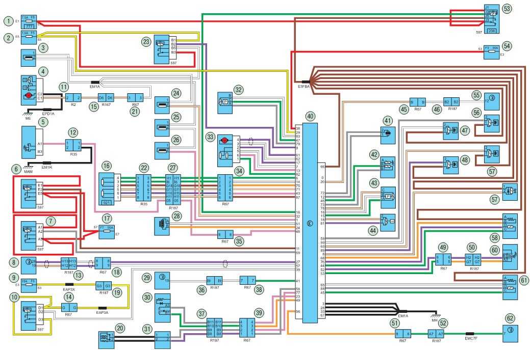 Схема 1. Система управления двигателем K4J с механической коробкой передач: 1,2,17,54 — монтажный блок моторного отсека; 3,24,25,26 — катушка зажигания; 4 — датчик уровня топлива; 5 — концевой выключатель педали сцепления; 6 — реле малой скорости вращения электровентилятора системы охлаждения двигателя; 7 — реле высокой скорости вращения электровентилятора системы охлаждения двигателя; 8 — блок управления электрооборудованием салона; 9 — монтажный блок в салоне; 10 — реле управления компрессором кондиционера; И, 12, 13,14, 15,18,19,21,22,27,34,35,36,37, 38, 39,45,46,49,50, 51,52 — колодка жгута проводов; 16 — датчик положения педали акселератора; 20 — выключатель круиз-контроля; 23 — реле топливного насоса; 28 — датчик положения коленчатого вала; 29 — электронный блок; 30 — регулятор круиз-контроля; 31 — клавиша управления круиз-контролем и подушкой безопасности; 32 — датчик давления хладагента; 33 — дроссельный узел; 40 — блок управления двигателем; 41 — датчик детонации; 42 — датчик температуры охлаждающей жидкости; 43 — датчик атмосферного давления; 44 — датчик температуры воздуха; 47,48,56, 57 — форсунка; 53 — реле блокировки впрыска; 55 — блок управления системой отопления (кондиционирования) и вентиляции; 58 — адсорбер; 59 — диагностический датчик концентрации кислорода; 60 — выключатель стоп-сигнала; 61 — управляющий датчик концентрации кислорода; 62 — диагностический разъем