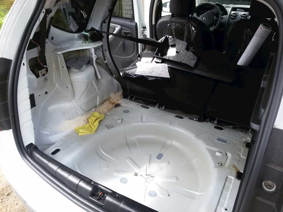 Вначале наклеивают виброизоляционный материал, особое внимание уделяют аркам и местам монтажа амортизаторов. Также оклеивают все большие поверхности, чтобы гасить звуки.